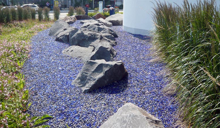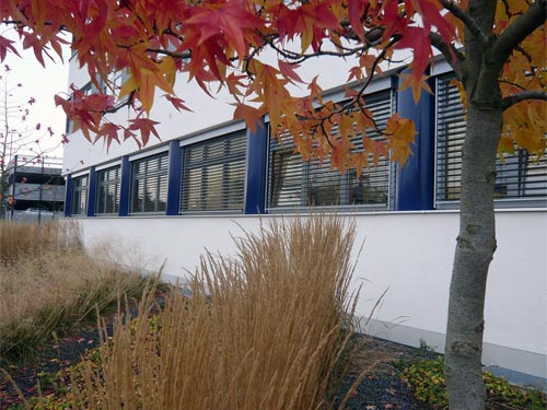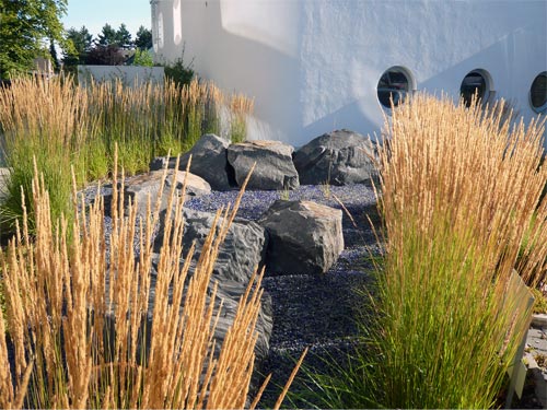 Steinblöcke, Gräserwellen und blauer Glassplitt „umspielen“ das schiffartige Ärztehaus
