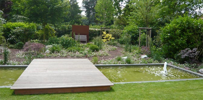 - Verbindendes Element: Rechteckiges Wasserbecken mit Schaumsprudler und Holzdeck