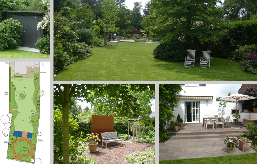 - üppiger Stauden-Gräser Bereich mit Mulchwegen und Cortenstahlwand als Blickpunkt