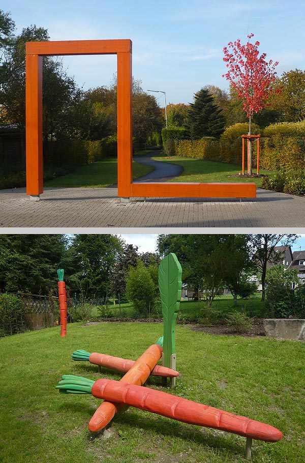 öffentlicher Bücherschrank und eine skulpturale Spielstation in Form von „Tanzenden Stangen“ bilden die Aufenthalts- und