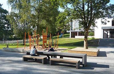 neuangelegte Pflanzstreifen aus Gräsern und Sträuchern rahmen den Platz. Lichtstelen geben dem Platz eine nächtliche Aufenthaltsqualität.