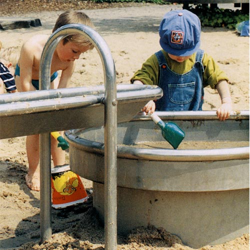 -ein Spielgarten für die Kita bestehend aus einer Sandlandschaft mit Wasser- und Matschspielplatz sowie Bodenmodellierungen und Kletter- und Rutschgeräten