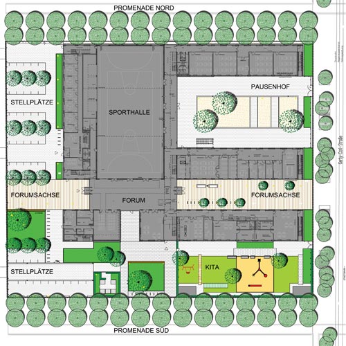 Vielfältige Aussenräume gliedern wie grüne Fugen das Stadteilzentrum: